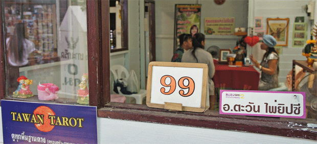 En Tailandia es muy común ir a ver al fortuneteller. Son adivinos que se dedican a ello y cobran para aconsejarte sobre tu vida. Los hay de todo tipo de tarifas (desde 50-1500 Baht a donaciones de mucho más) y los visitan tanto humildes trabajadores como familias adineradas o gente con buenos trabajos. Los llaman Mo duu (el médico visionario o que ve) y dan consejos sobre cualquier aspecto de la vida. Normalmente la gente los visita por los temas de siempre: trabajo, familia, dinero o amor. Si os dais una buena vuelta por Bangkok seguro que en alguna calle o cafetería acabaréis viéndolos dando consejos a algún ‘cliente’.
