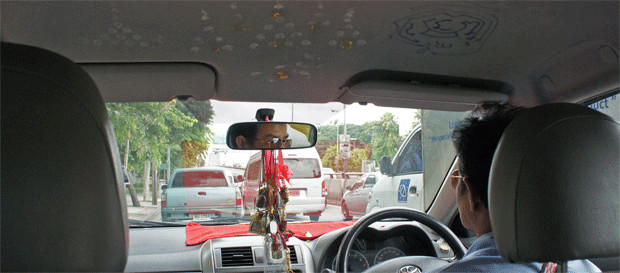 En Bangkok hay miles y miles de taxis. Estoy seguro que es una de las ciudades con la mayor proporción de taxis del mundo sino que la más. Además, al funcionar con gas, son muy económicos. Los taxis en Bangkok darían para todo un artículo. Los menciono aquí por una de las características que los hacen más originales: los amuletos que llevan dentro.