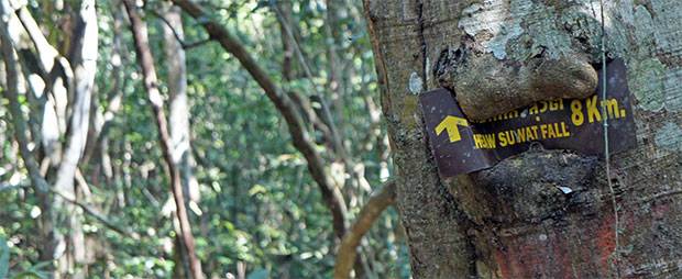 Esta excursión de 10 km empieza en el centro de visitantes. Se hace en 2-3h. Si aparcáis el vehículo en el centro de visitantes, fácilmente encontraréis el punto de comienzo detrás del edificio del centro. Al principio es un camino asfaltado, pero rápidamente deja de serlo. Tendréis que tomar un desvío indicado en la señal de la foto que marca Haew Suwat Waterfall (un poco escondida). A partir de ahí son 2-3 horas por la jungla en un camino bastante bonito hasta llegar a la cascada de Haew Suwat, la más famosa del parque.
