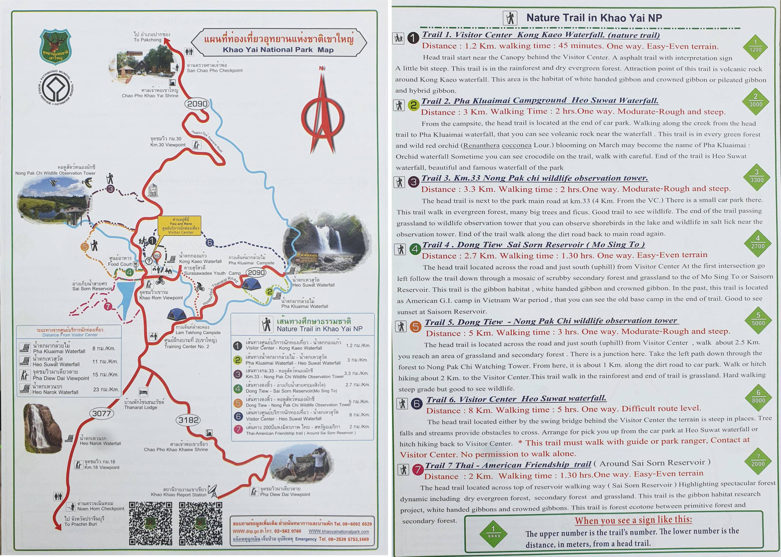 Yo he hecho varias veces la excursión número 5 y me parece que es la más adecuada para una primera visita al parque. A ritmo lento, os llevará unas 3h. A ritmo rápido la haréis con menos tiempo. Podéis alquilar los servicios de un guía (ranger) del parque para que os lleve. Los guías cobran entre 500 y 1000 THB dependiendo de la excursión. Esta excursión empieza justo al lado del centro de información y termina en un bonito mirador de aves. Desde allí necesitaréis un vehículo o hacer autoestop para volver al centro de información.Con-el-guía-por-Khao-Yai