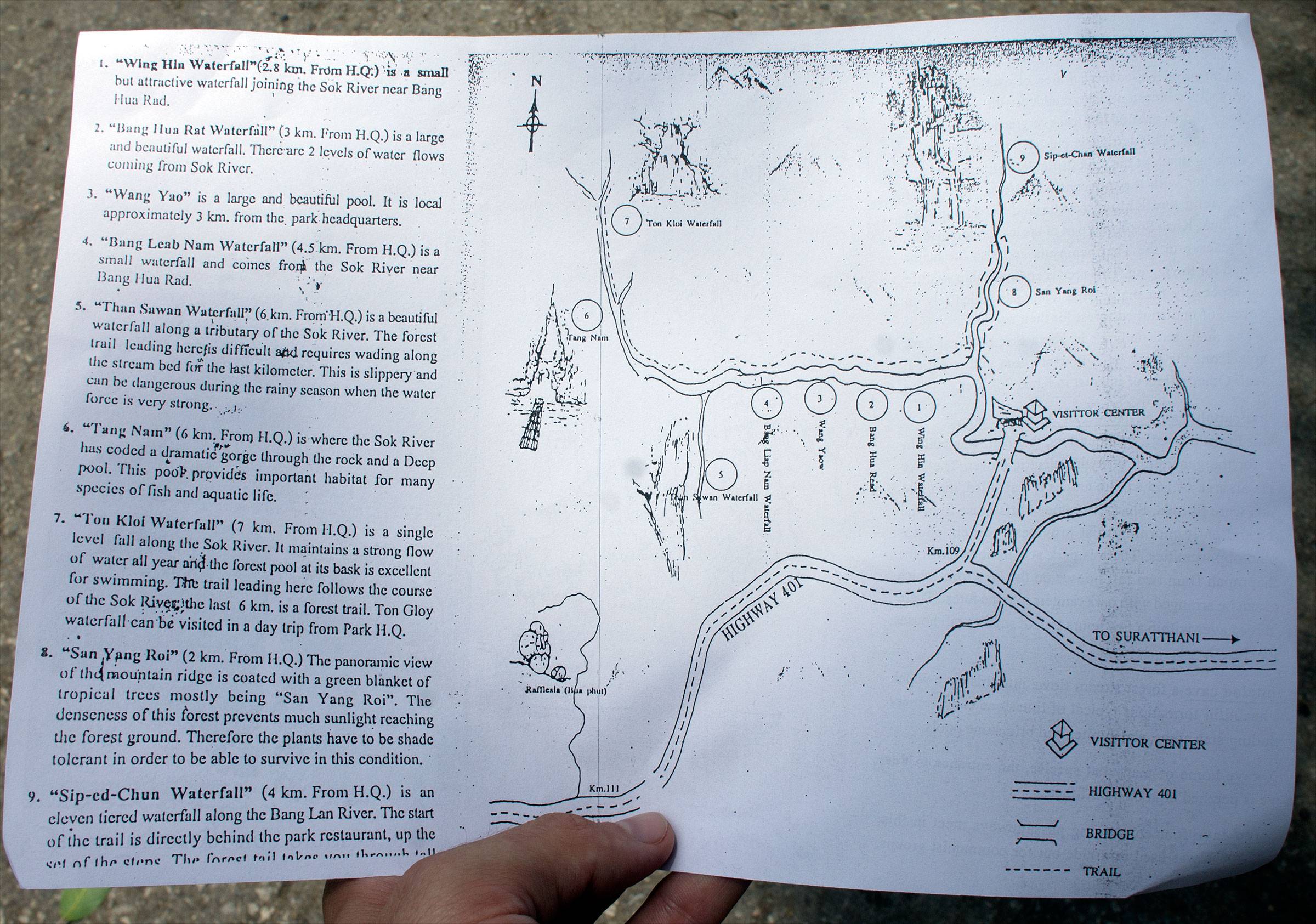 Veréis que hay 9 puntos que se pueden visitar, estando el más cercano a 2,8 kms de la entrada y el más alejado a 7 kms, aunque al empezar la excursión veréis una señal enorme que te prohibe hacerlas sin guía. Si preguntas a los del parque te dirán que en realidad sí se puede ir hasta el punto número 4: Bang Laeb Nam Waterfall a 4,5 kms de la entrada. Nosotros fuimos, sin guía, hasta el punto 6 y sin problemas. Fueron 6 kms ir y 6 volver y llegamos hasta una zona del río con una pequeña piscina natural muy agradable para bañarse. Está bastante indicado y solamente hay que ir siguiendo el ruido del río, si bien es cierto que en algún punto puede ser confuso.