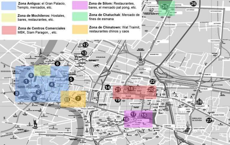 Los números en el mapa corresponden al número que tienen los lugares en la guía de Bangkok en PDF. Por ejemplo el número 1 corresponde a la Ficha 1, la del Gran Palacio. El 2 al Templo Wat Pho; el 3 al Templo Wat Arun; el 15 al Parque Lumphini; el 18 al Centro comercial Siam Paragón; el 19 al Centro comercial MBK; el 14 a la Casa de Jim Thompsom; el 5 al Templo Wat Saket; y el 10 a Khao San Road, la calle de mochileros.