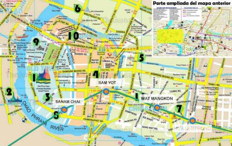 El punto 1 es el Gran Palacio, el 2 es el Wat Arun, el 3 es el Wat Pho, el 4 es el Buda de Oro, el 5 es el Wat Saket, el 6 es el Bude De Pie, 7 es el Wat Traimit (aunque lo interesante es la calle de Yaowarat conocida por ser la calle principal de China Town), el 8 es el Museo de Siam, el 9 es el Museo Nacional y el 10 es Khao San Road.