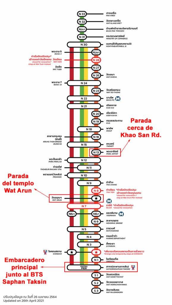 En Bangkok hay barcos públicos que recorren el río Chao Phraya. Hay varias rutas diferenciadas por el color de sus banderas, aunque la más popular y frente entre los viajeros es la de color naranja.
