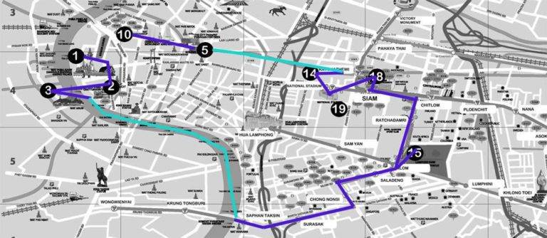 Esta es una ruta que podéis hacer fácilmente en una visita a Bangkok. Este mapa forma parte de la guía de Bangkok en PDF que podéis descargar gratis.