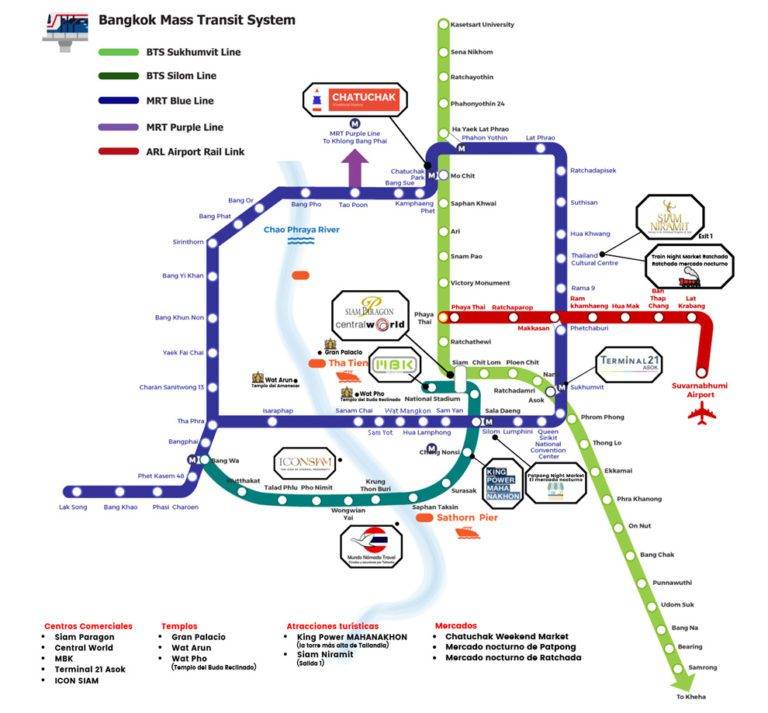 • Skytrain (BTS): Es un sistema de metro elevado que va por encima de la ciudad que cuenta con dos líneas principales y que conecta la zona de negocios con los centros comerciales más conocidos y los puntos de interés.