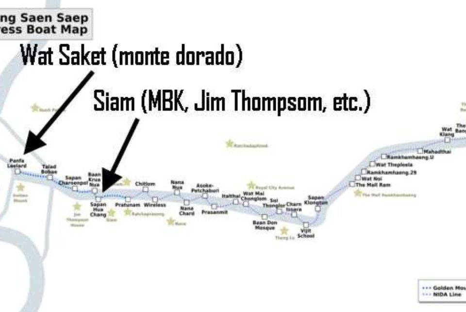 El sistema de botes en el canal Khlong Saen Saep es una opción alternativa para moverse entre la zona antigua y la moderna. El mapa que tenéis a continuación detalla las paradas del bote por el canal (Khlong Saen Saep) de Bangkok (no confundir con el río). Estas paradas no aparecen en el mapa anterior. En la zona antigua tiene paradas cerca del Wat Saket y cerca de los centros comerciales MBK, Siam Paragon y Central World o de la Casa Jim Thompsom.