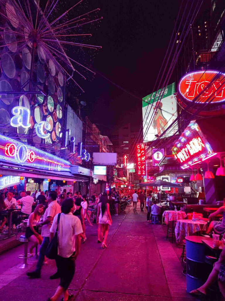 La calle roja de Bangkok por excelencia, repleta de bares de striptease donde las camareras en bikini sirven las bebidas. El primer bar de la calle fue abierto por un americano en los años setenta que solía llevar un sombrero al estilo cowboy, de ahí el nombre.