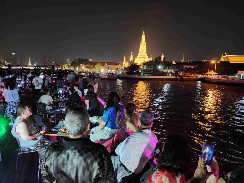 Las cenas a bordo de un bonito crucero o una antigua barcaza de arroz por el río Chao Phraya, son muy típicas en Bangkok y hay mucha oferta de cruceros y barcos. Suelen empezar alrededor las 18h y 19h y durar un par de horas. Normalmente se trata de un bufet libre de comida internacional y asiática con música en directo y danzas tradicionales, si bien, los más lujosos como el Manohra cuentan con un set-menú de diferentes platos tradicionales.
